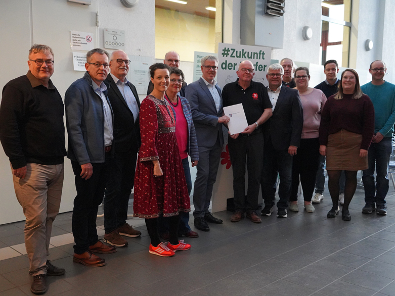 Landrat Christian Engelhardt überreicht den Zuwendungsbescheid zusammen mit (v.l.n.r.) Christina Müller (Fachbereichsleitung Dorf-und Regionalentwicklung Kreis Bergstraße) an Beate Dreyer (Geschäftsführung TV Fürth), Fritz Eisenhauer (Projektleitung Hallenumbau), Rekha Krings (Geschäftsführung IGO) und Volker Oehlenschläger (Bürgermeister Fürth).