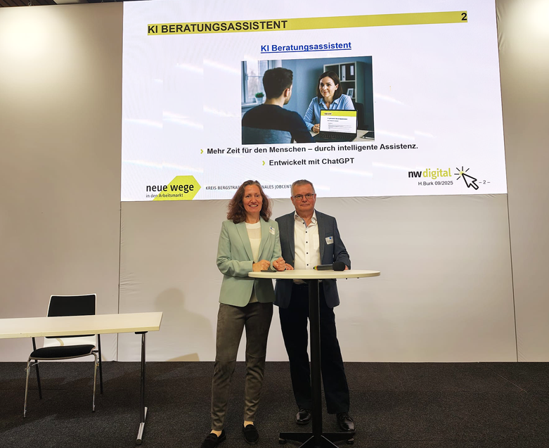 Beim „Tag der kommunalen Jobcenter“ in Berlin stellten die Leiterin des Eigenbetriebs, Dr. Melanie Marysko, und Entwickler Helmut Burk den KI-gestützten Beratungsassistenten von Neue Wege Kreis Bergstraße vor. Foto: Pressedienst Bergstraße