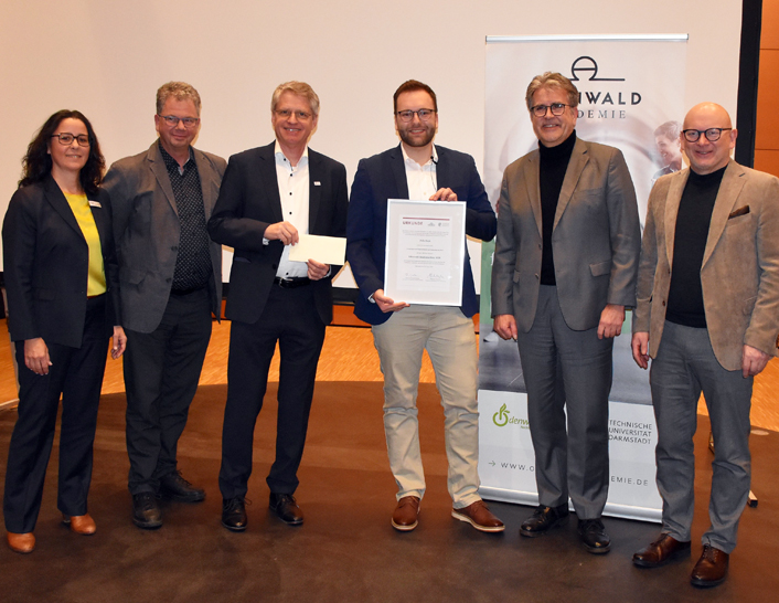Ausgezeichnet: Felix Koch mit der Urkunde in der Hand. Ihm gratulieren (von rechts) Landrat Frank Matiaske sowie die drei Mitglieder der Preis-Jury Rüdiger Holschuh, Vorsitzender des Fördervereins der Odenwald-Akademie, Prof. Dr. Thomas Walther, Vizepräsident der TU Darmstadt, und Prof. Dr.-Ing. Hans-Joachim Linke, TU Darmstadt, und Raquel Jarillo von der Odenwald-Akademie. Foto: Stefan Toepfer/Kreisverwaltung