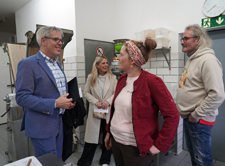 Philipp Bihn und seine Tochter Ninotschka Bihn gewährten Corinna Simeth und Landrat Christian Engelhardt (von rechts) auch einen Blick hinter die Kulissen in die Backstube ihrer Bio-Bäckerei. Foto: Pressedienst Bergstraße