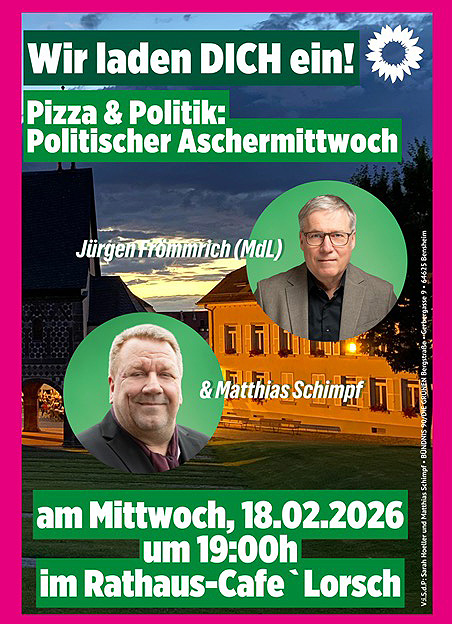 Unter dem Motto >Pizza & Politik< werden der hessische Landtagsabgeordnete und stellvertretende Fraktionsvorsitzende der GRÜNEN Jürgen Frömmrich und Matthias Schimpf, Lorscher Fraktionsvorsitzender und Spitzenkandidat der GRÜNEN Lorsch für die Kommunalwahl am 15. März 2026 zu aktuellen Themen der Landes -Kreis -und Stadtpolitik Stellung beziehen.