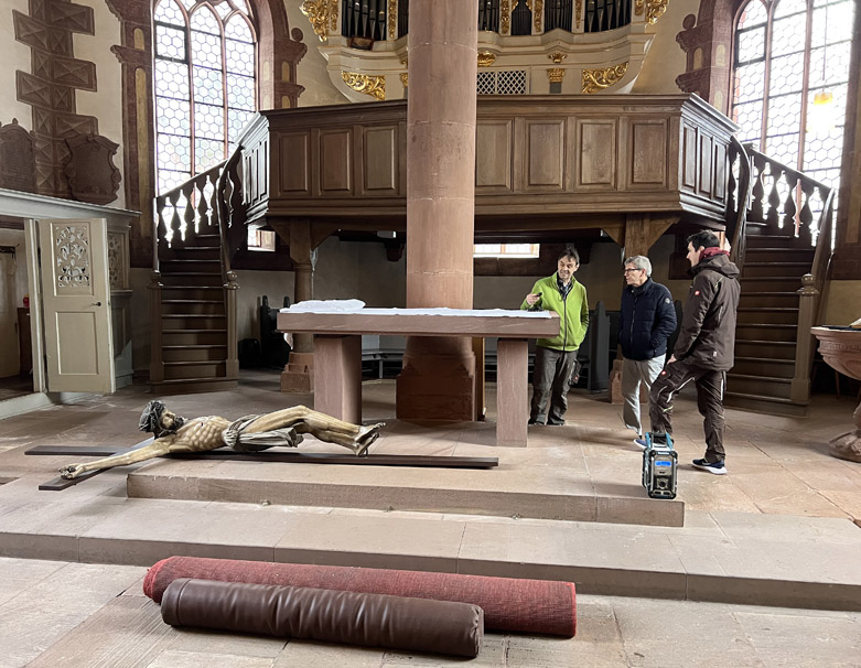 Besprechen, wie es weitergeht: Kirchenvorstandsvorsitzender Jürgen Paul (Mitte) mit den Michelstädter Handwerkern Holger (links) und Marvin Lehr, die auch das markante große Kruzifix für die Bauarbeiten im Inneren der Höchster Kirche abgenommen haben. Foto: Bernhard Bergmann