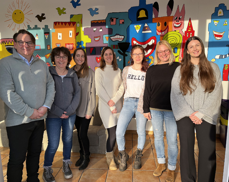 Freuen sich über die gelungene Zusammenarbeit der Familienzentren: Dr. Tobias Robischon (Bürgermeister Michelstadt), Stéphanie Lang (Leiterin des Amtes für Kinder, Jugend und Familie Michelstadt), Rebecca Wallmeroth und Jana Pereira Mendes (Bildungskoordinatorinnen des Familienzentrums Michelstadt), Jasmin Götz (Betreuerin der „Drop In“-Krabbelgruppe), Nicole Schork (Koordinatorin des Caritas Familienzentrums Erbach) und Nadja Riss (Dienststellenleiterin des Caritas Familienzentrums Erbach, von links). Foto: Pressedienst Michelstadt