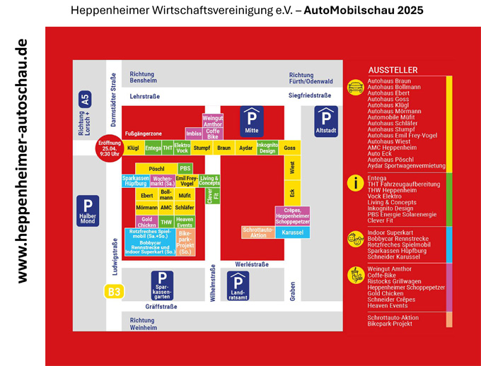 Unter der Schirmherrschaft des Landrats des Kreises Bergstraße, Christian Engelhardt, fahren Aussteller aus den Segmenten PKW, E-Autos, LKW/Transporter, Wohnmobile, Oldtimer, Motorräder, Folierung, Ladeinfrastruktur, Fahrzeugreinigung und -aufbereitung im Veranstaltungsbereich Friedrichstraße, Graben (Nord), Wilhelmstraße, Parkhof und Fußgängerzone auf.
