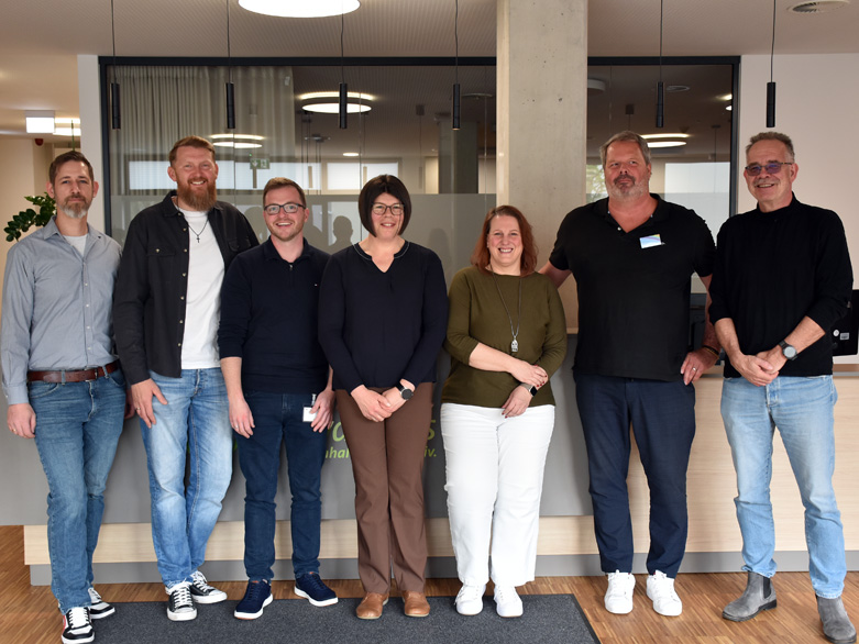 Gemeinsam für junge Menschen: Im Foyer des Jugendamts stehen an der Seite von Jugendamtsleiterin Karina Glabisch (Mitte) Vertreter von sechs Jugendhilfeträgern, nämlich (von links) Nils Reiß, Nikolai Klostreich und Christian Senker sowie Susanne Rebscher, Steffen Fiedler und Frank Wiedenmann. Foto: Stefan Toepfer/Kreisverwaltung