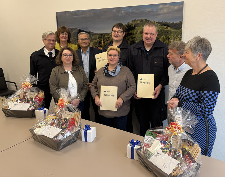 Bei der Ehrung: Stadtbrandinspektor Jens-Peter Karn, Bettina Prey-Ost (Team Personalmanagement), Elke Ritter (Personalratsvorsitzende), Rolf Hiesinger (Fachbereichsleiter), Jürgen Ritz, Tanja Rettig, Peter Karn (jeweils 25 Jahre i...