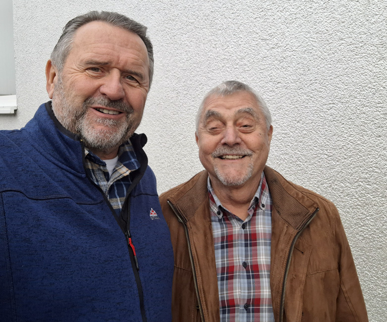 Walter Öhlenschläger, Spitzenkandidat der Freien Wählergemeinschaft Kreis Bergstraße (links), im Gespräch mit Walter Benz, dem Fraktionsvorsitzenden der Unabhängigen Bürger Viernheim (UBV) im Viernheimer Stadtrat. Foto: Pressedienst FWG Kreis Bergstr...