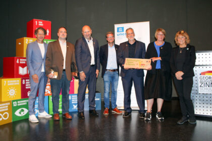 Die Übergabe der Plakette „Nachhaltigkeit lernen in Hessen“ durch Silvia Fengler vom Hessischen Ministerium für Landwirtschaft und Umwelt (Zweite von rechts) an Schulleiter Direktor Herwig Bendl (Drit...