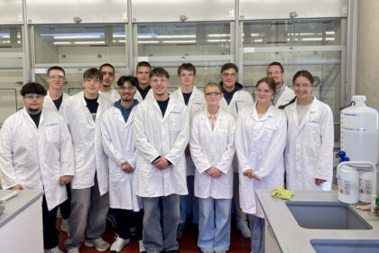 Die angehenden Abiturienten der GAZ mit ihrem Fachlehrer Maximilian Kroworsch im Merck-Juniorlabor in Darmstadt. Foto: Maximilian Kroworsch Maximilian Kroworsch / Raoul Giebenhain REICHELSHEIM / DARMS...