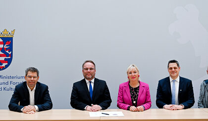 Prof. Dr. Thomas Nauss (Sprecher der Konferenz der hessischen Universitäten), Timon Gremmels (Hessischer Minister für Wissenschaft und Forschung, Kunst und Kultur), Prof. Dr. Kristina Sinemus (Hessisc...