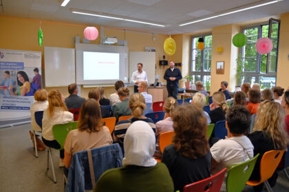 Jörn Lorenz (links) und Christopher Frett (rechts) vom Beratungsbüro „Lernbauten“ stellte der Schulgemeinde der Schillerschule Lampertheim die nächsten Schritte in der Leistungsphase Null vor. Foto: P...