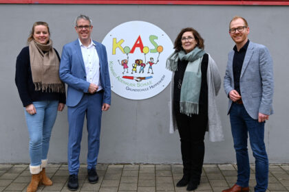 Schulleiterin Angelika Kicherer (3. von links) und ihr Schulleitungsteam mit Sandra Großfeld (links) haben Landrat Christian Engelhardt (2. von links) und Eigenbetriebsleiter Johannes Kühn (4. von lin...
