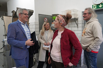 Philipp Bihn und seine Tochter Ninotschka Bihn gewährten Corinna Simeth und Landrat Christian Engelhardt (von rechts) auch einen Blick hinter die Kulissen in die Backstube ihrer Bio-Bäckerei. Foto: Pr...