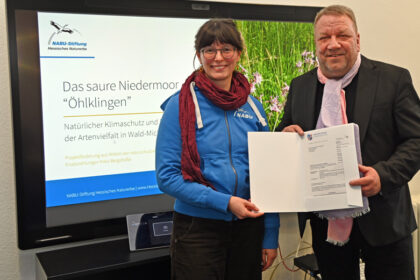 Der hauptamtliche Kreisbeigeordnete und zuständige Dezernent Matthias Schimpf überreichte den Zuwendungsbescheid an Anne Michaeli von der NABU-Stiftung Hessisches Naturerbe. Foto: Pressedienst Bergstr...