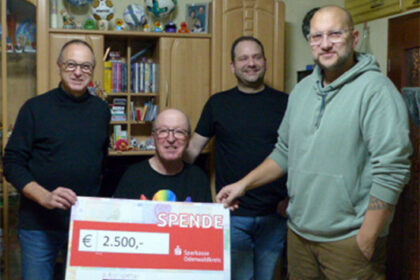 Die Vertreter des Vereins „Generation Oberzent e.V.“ Klaus Johe, Andreaas Weinmann und Michael Hofmann (stehend von links) überreichten Jürgen Nebel symbolisch einen Scheck in Höhe von 2.500 Euro für ...