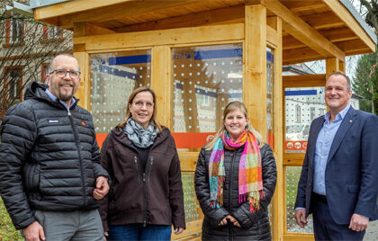 Bei der Vorstellung der neuen Wartehalle am Bahnhof in Beerfelden: Stefan Reinhardt (OREG – Geschäftsbereichsleiter Nahverkehr), Marion Bechtel (OREG – Sachbearbeiterin Haltestelleninfrastruktur...