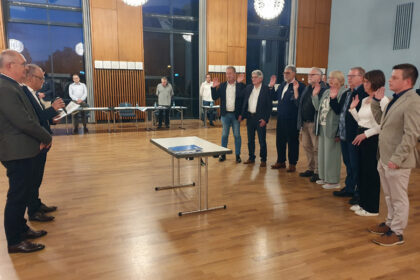 Der neugewählte Erste Stadtrat der Odenwälder Kreisstadt Erbach, Dominik Weyrauch (CDU), und seine Magistratskollegen Nicole Kelbert-Gerbig, Stefan Eckert (beide SPD), Lucie Myska (ÜWG), Andreas Braun...