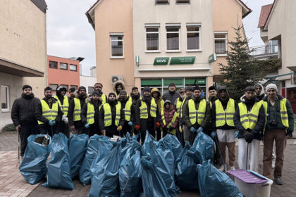 Zu einem Erinnerungsfoto, gemeinsam mit dem Höchster Bürgermeister Jens Fröhlich (hinten, Mitte) kamen die Mitglieder der Ahmadiyya Muslim Gemeinde Odenwaldkreis nach getaner Arbeit am 01. Januar 2026...