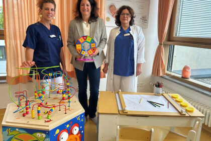 Sandra Rapp (Leitung Entbindungsstation), Andrea Kruse (Rotary Club Erbach-Michelstadt) und Inna Bespalova (Oberärztin Frauenklinik, von links) freuen sich über die neu gestaltete Kinderecke auf der E...