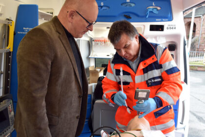 Modern ausgestattet: Dr. Bernhard Krakowka erläutert Landrat Frank Matiaske (links) in einem Rettungswagen an einer Puppe eine Video-Laryngoskopie. Die Kamera bietet eine Sicht auf den Kehlkopf und di...