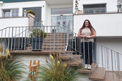 Sabrina Burghardt, hier vor dem Eingangsportal zum Bad Königer >Pflegezentrum Rosenhöhe<, rettete mit Mut und dem Vertrauen auf eigene Erfahrung und Leistungsfähigkeit 240 Mitarbeitenden den Job un...
