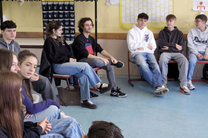 Emma und David im Gespräch mit Schülern aus der Klasse 9b der GAZ Reichelsheim. Foto: René Beck René Beck / Raoul Giebenhain REICHELSHEIM. – Einen besonderen Unterrichtstag erlebte die Klasse 9b...