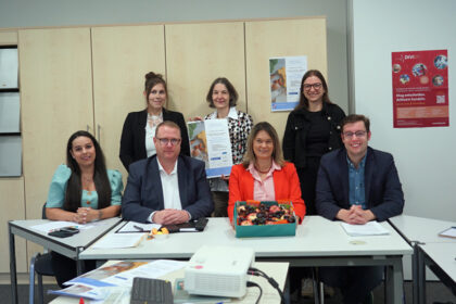 Die Erste Kreisbeigeordnete und Gesundheitsdezernentin Angelika Beckenbach (untere Reihe, 2. von rechts) informiert gemeinsam mit dem hauptamtlichen Ersten Stadtrat Lampertheims Marius Schmidt (rechts...