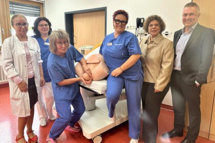 Dr. med. Julia Mann (Chefärztin Frauenklinik), Inna Bespalova (Oberärztin), Margret Höver und Nicole Olbert-Walter (Hebammen), GZO-Geschäftsführerin Abir Giacaman, Gunter Krämer (Sparkasse Odenwaldkre...