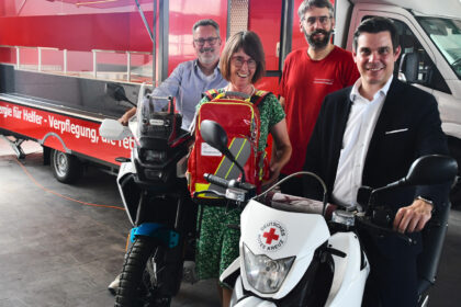 Marco Laut, Stiftungsvorstand der Sparkasse Odenwaldkreis, DRK-Jugendkoordinator Adrian Knecht sowie mit Sanitätsrucksack Sachbearbeiterin Nicole Kelbert-Gerbig und DRK-Vorstand Frank Sauer (von recht...